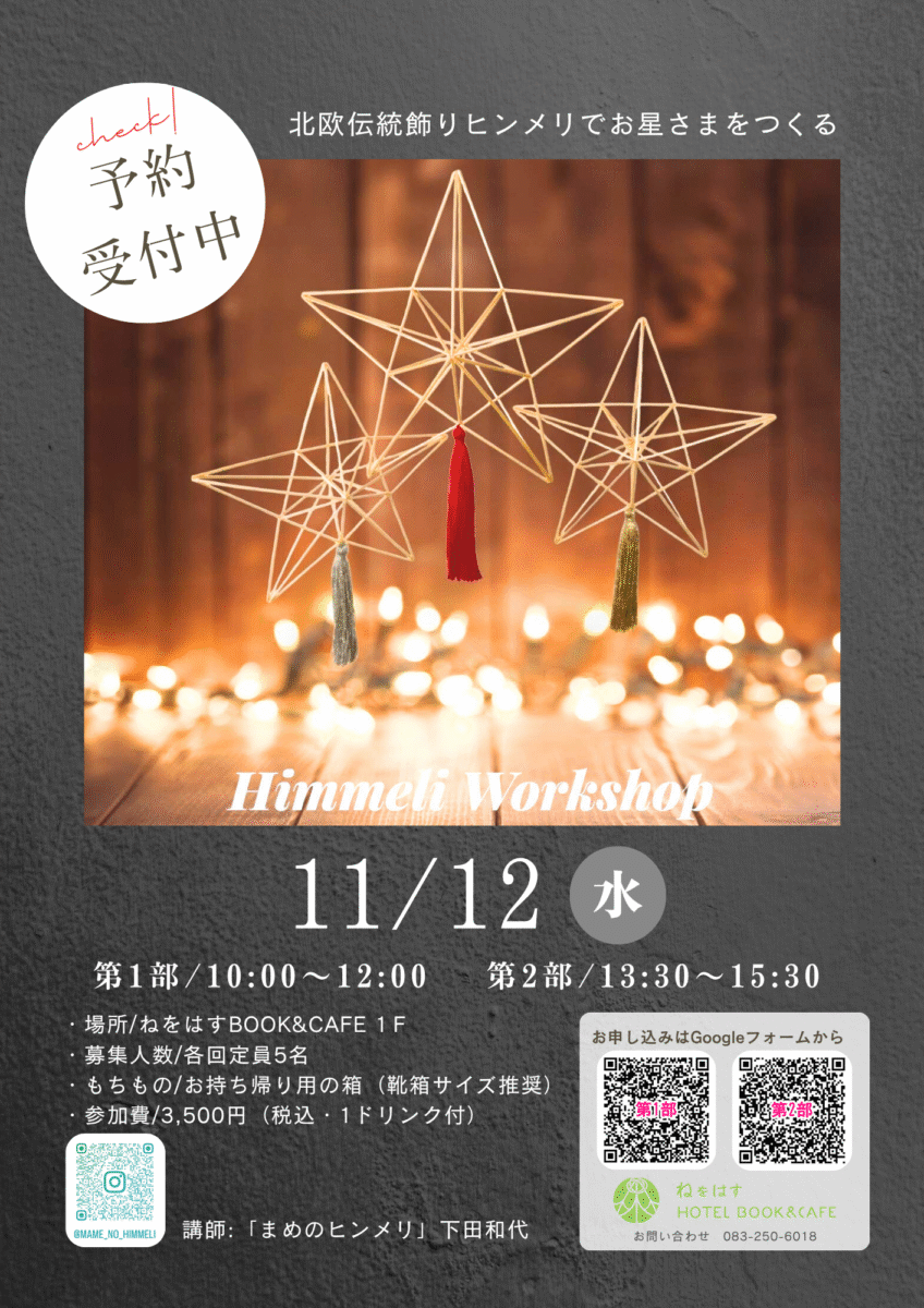 どちらもヒンメリお持ち帰り用の箱(靴箱サイズ推奨)をご持参ください。1ドリンク付きですので、ゆったり手仕事の癒し時間を楽しみましょう✨