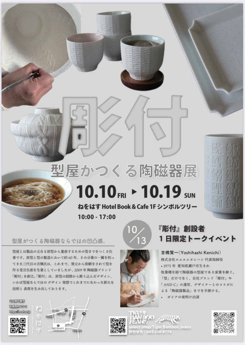 10月10日(金)から10月19日(日)においてねをはす1Fシンボルツリー周りで瀬戸焼の型屋/(株)エムエムヨシハシの陶磁器ブランド「彫付」のポップアップを開催します。