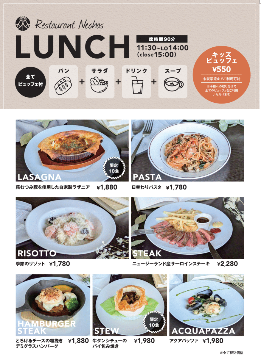 全てのランチメニューにパン・サラダ・スープ・ドリンク が付きます☕